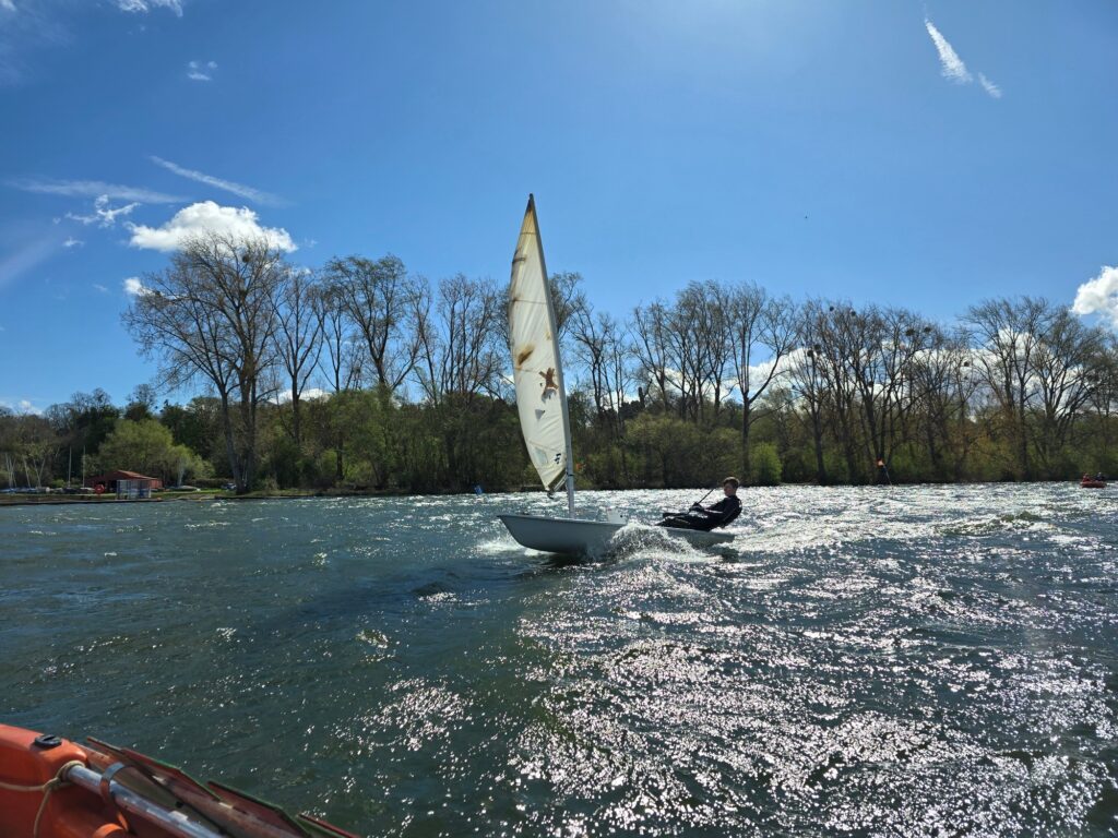 In the first race, Rhys was first round, with Steve S close behind. Both Wills & Darren had issues with capsizing, sitting themselves further back in the fleet.
