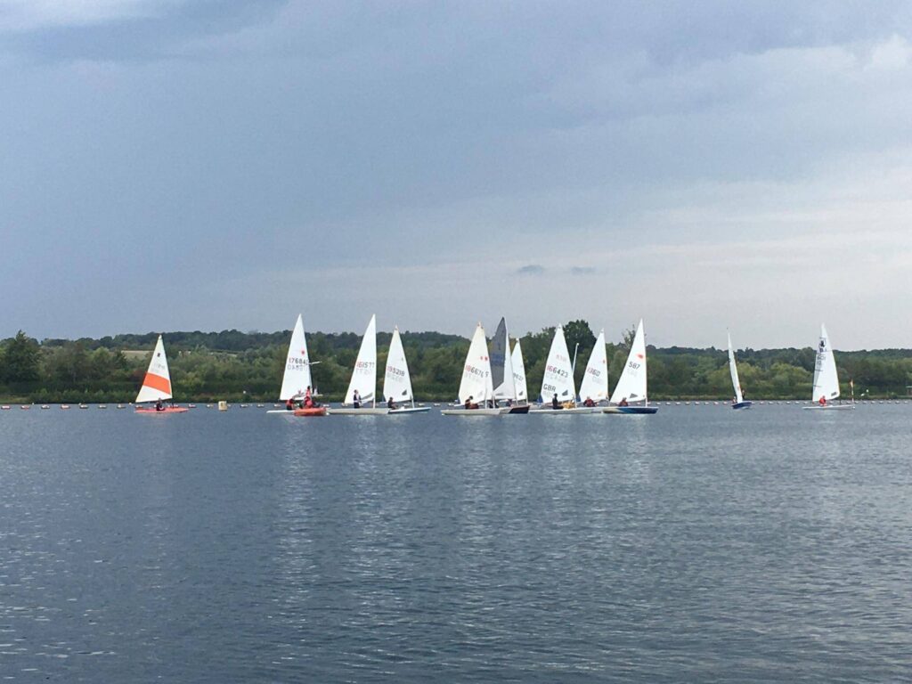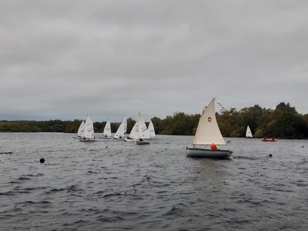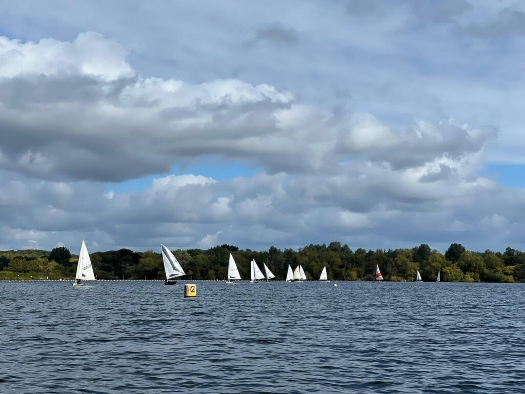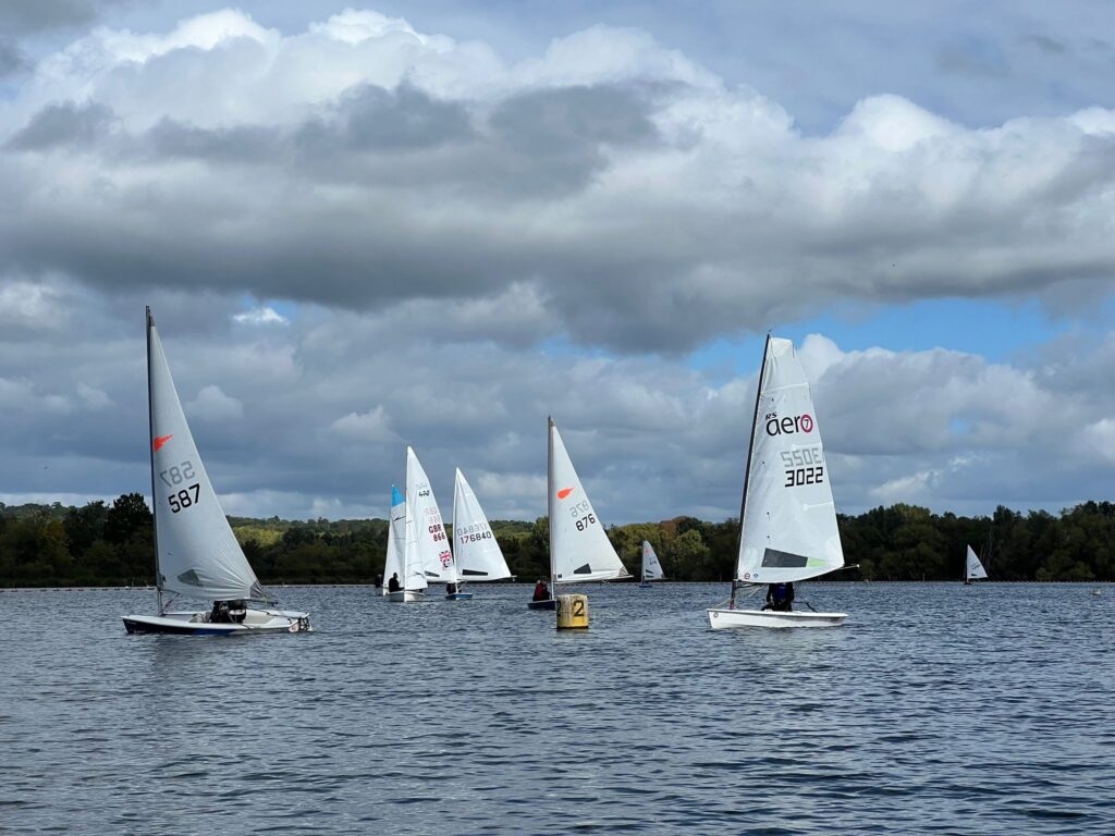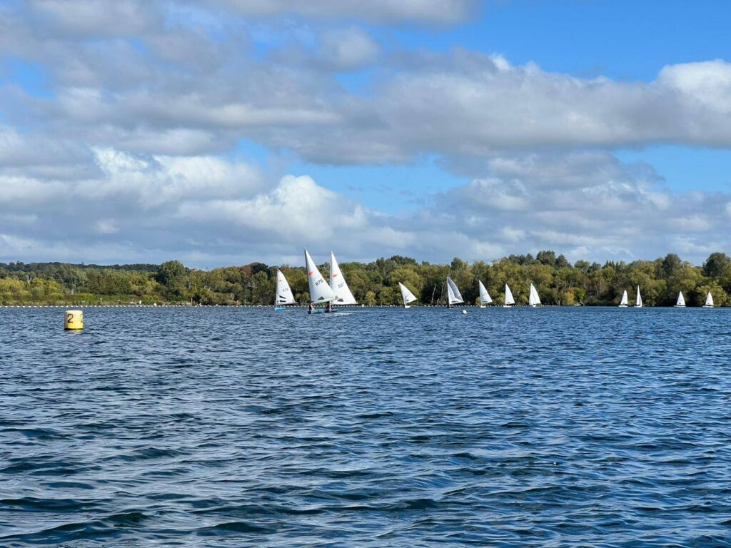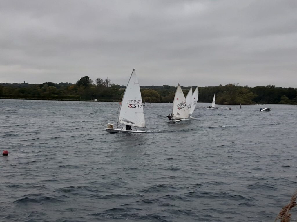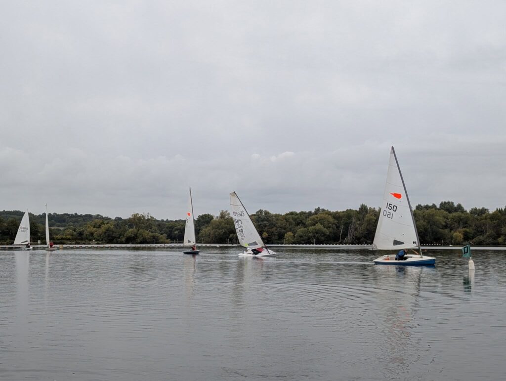 Typically coming from the south, the wind direction meant a short course at the far end of the lake. 17 boats made it out for the Pursuit race, which was led by Tatiana (Topper) at the start, who set off first. The rest of the fleet then set off to catch up, with a lull allowing the ILCA 7’s to catch up with the slower boats almost immediately. It was a busy first beat, with all the boats close together, vying for position.